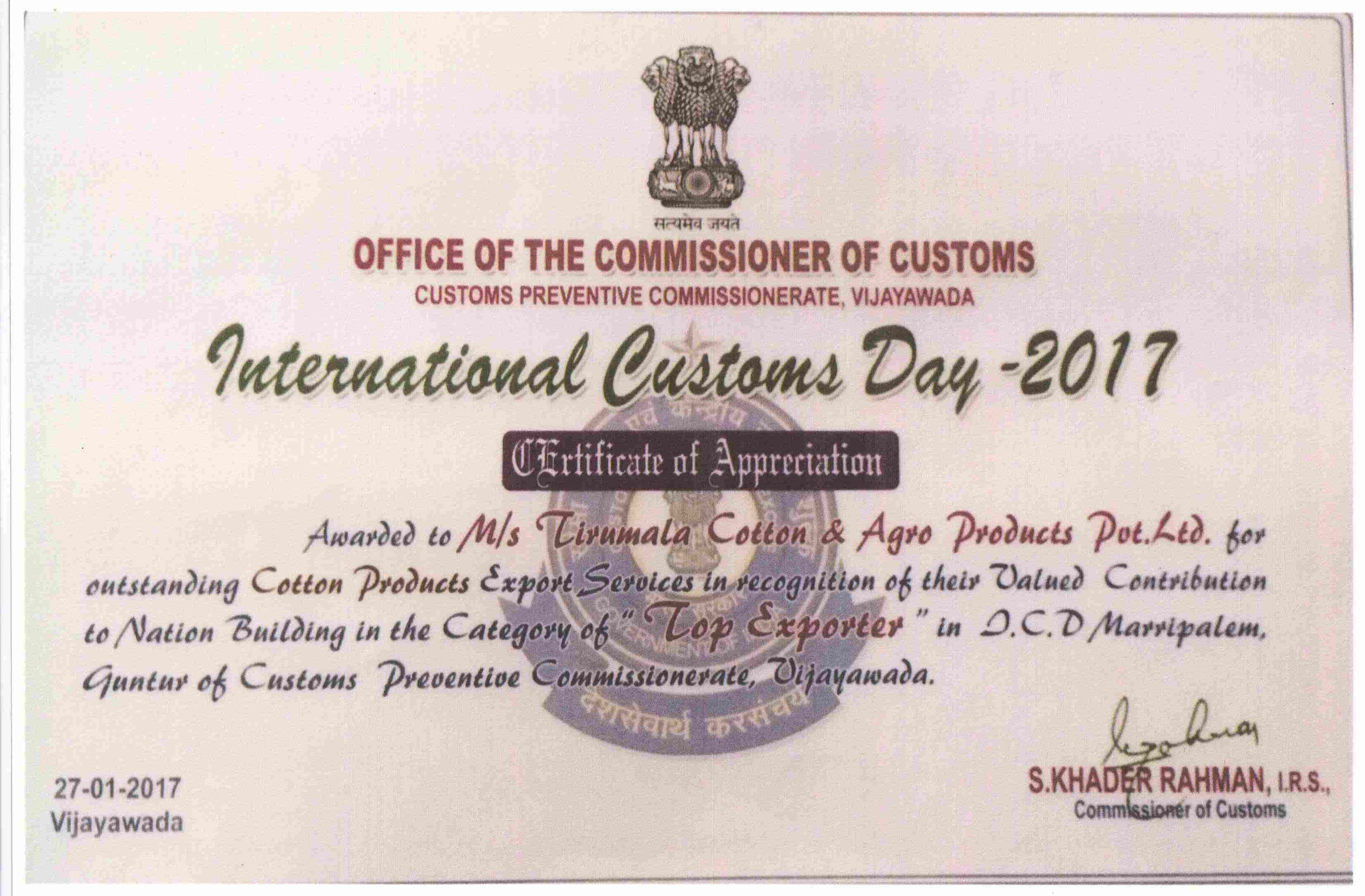 - TOP EXPORTER IN ICD MARRIPALEM -2017 GUNTUR.